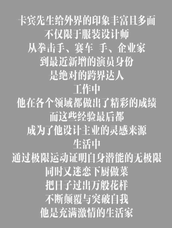 想要成为服装设计师的想法调动起了他寻找灵感的所有神经,对新鲜理念的追求推着他不断进入新的领域, 挑战自我获得更多启发,而这些跨界最后又反哺了他的服装主业,成为他天马行空、不设限的灵感来源。在《吃素的小爸,我爱你》网剧中担任艺术总监并担当其中一个重要角色。初次当角,卡宾先生重新审视了自己现实中的「设计师」角色,虽是本色演出,但是也需要跟多年好友 吕颂贤以及导演进行交流,需要进入角色重新揣摩二十年前的心境,跟着角色回到过去的状态。卡宾先生总在 接受有趣的挑战,从不同身份中获得的认知,让他对生活有了更深的理解,切换身份参悟生活,便能够认识更多新事物,也能对同一事物有更多面向的理解。卡宾先生说他的毕生时间都会投身于服装设计,但他也将步履不停,跳出本身舒服的区域、给自己寻找新身份。对他来说,看似跳跃的角色,背后都有一样的信念支持,任何角色都只有打破认知和思维边界,才能透过不同角色看到新景色。就像每一季服装的主题与版型的设计,其实都是基于对再熟悉不过的面料等旧元素的新创造,如何在新一轮的重组里产生协调感与美感,作为艺术总监,卡宾先生的方式是将多重身份获得的灵感排列组合,成为最终可以表现在服装上的、符合品牌调性的一种有原创精 神的设计力。即使不了解品牌背后的这位艺术总监,他的「跨界」激情也可以直接从服装设计上窥见一二。例如 Cabbeen(卡宾)品牌最新推出的春夏系列服装,就在设 计上帮助消费者在生活中的自如「跨界」,可拆卸的服装元素让男生们在各种场合能轻松转换身份,以最舒适同时也是有趣的形象出众展现个性。