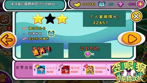 每通过一个关卡后,游戏会根据玩家所达成的指标进行评星,评星的指标通常是有3条,每一条计1星,最高是3星。关卡除了有通关奖励外,3星通关也有丰厚的钻石奖励。除了关卡评星外,还有关卡得分,每个关卡都会记录最高记录的分数,展示于该关卡中,让挑战极限的酷友们,芳名永传。
