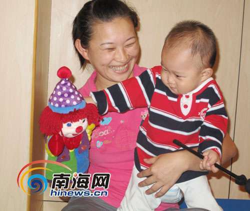 母亲拿着金宝贝里面的玩具逗儿子开心 (南海网记者陈望 摄)
