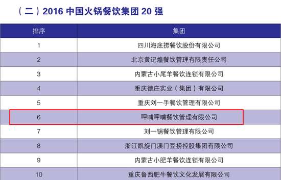 值得一提的是,根据中国饭店协会火锅专业委员会公布的最新行业调查报告,即在2016年6月发布的《2015-2016中国火锅产业调查报告》(简称“报告”)显示,在其“2016 中国火锅餐饮集团 20 强”的榜单中,呷哺呷哺位列第6名。