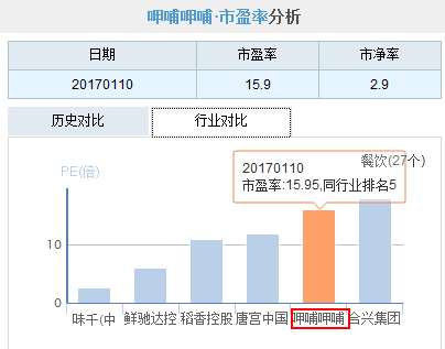 智通财经注意到,呷哺呷哺的PE在同业中居于较高水平。根据同花顺显示的行业对比数据,2017年1月10日,呷哺呷哺的PE为15.95倍,在所对比的6家企业中,居于第5位。而味千中国(00538)PE最低仅为2.61倍。