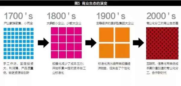商业体系的形成经历了几百年的进化,最初是小而全的时代,工匠作坊作为一个产业阶层,专注于个体间竞争。到20世纪的大批量规模化生产时代,企业基于价值链竞争。随着21世纪专业化分工、跨界整合时代的到来,形成了连接企业利益相关者的商业生态圈(见图5)