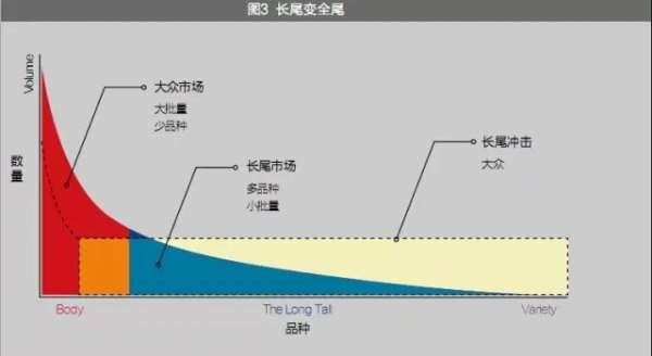 在网络世界有一个现象,那些少数热销的大众产品和众多冷门的小众产品,其市场份额呈现出一条带有长长尾巴的曲线。当把尾巴的所有冷门市场汇集起来,其市场能量可以超过大众产品的市场能量。这就是长尾理论(见图3)。