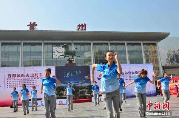 9月24日,百名兰州西客站准“高哥”、“高姐”在兰州车站广场宣誓明责、展现才艺、劲歌热舞、发放传单,竭力向现场旅客和市民推介铁路客运便民举措和业务。据兰州火车站工作人员介绍,随着兰(兰州)新(新疆)客专建设进入收尾阶段,兰州铁路局即将跨入高铁时代。当日,多彩的画面和丰富的视觉体验增强了在场旅客和货主对“西部城际客运列车”和“西部货物快运”的了解。图为9月24日,百名兰州西客站准“高哥”、“高姐”在兰州车站广场宣誓明责、展现才艺、劲歌热舞、发放传单,竭力向现场旅客和市民推介铁路客运便民举措和业务。图为:“