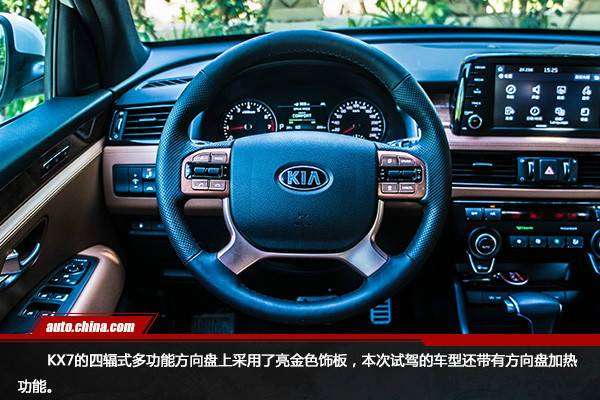 KX7的四辐式多功能方向盘上采用了亮金色饰板,本次试驾的车型还带有方向盘加热功能。