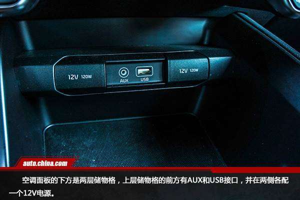 空调面板的下方是两层储物格,上层储物格的前方有AUX和USB接口,并在两侧各配一个12V电源。