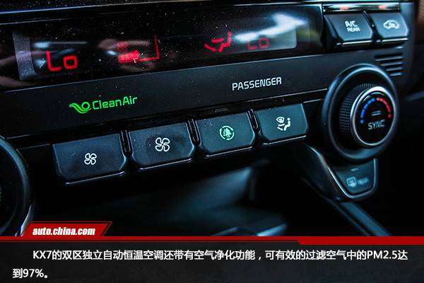 KX7的双区独立自动恒温空调还带有空气净化功能,可有效的过滤空气中的PM2.5达到97%。