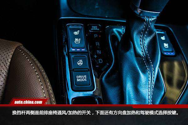 换挡杆两侧是前排座椅通风、加热的开关,下面还有方向盘加热和驾驶模式选择按键。