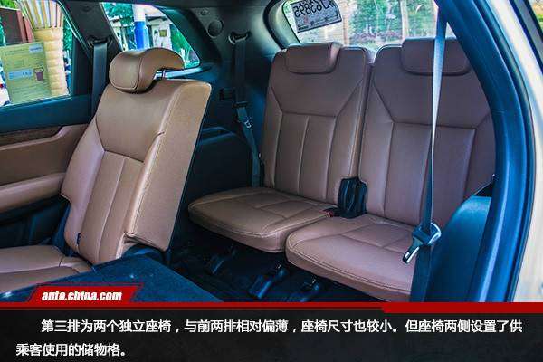 第三排为两个独立座椅,与前两排相对偏薄,座椅尺寸也较小,不过座椅两侧设置了供乘客使用的储物格。