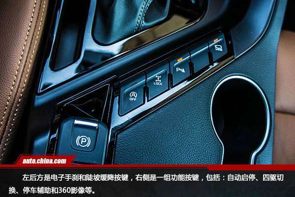 左后方是电子手刹和陡坡缓降按键,右侧是一组功能按键,包括:自动启停、四驱切换、停车辅助和360影像等。