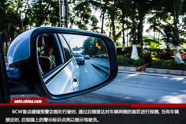 BCW盲点碰撞预警功能在行驶时,通过后侧雷达对车辆两侧的盲区进行探测,当有车辆接近时,后视镜上的警示标识点亮以提示驾驶员。
