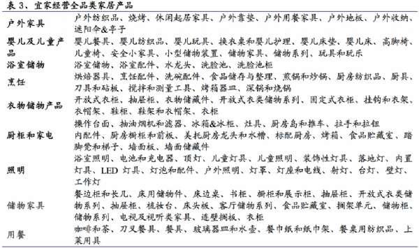 宜家提供全品类的家居产品,包括从座椅/沙发系列、办公用品、卧室系列、厨房 系列到照明系列、纺织品、炊具系列、房屋储藏系列、儿童产品系列等约9500个产品。风格强调“简约、自然、清新和设计精良”,既继承了传统又体现了时代感,独特、自主的产品设计保证风格与众不同。宜家产品的主要目标消费群体是25-35岁的年轻人,宜家精良的设计能够满足其追求年轻化、时尚化的消费需求。