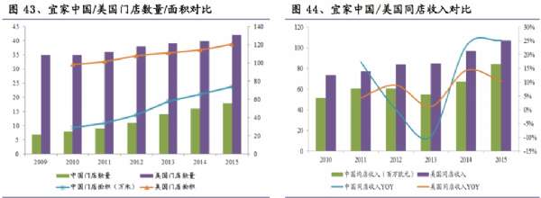 对比宜家中国/美国,两者已经进入不同的发展模式:外延方面,2009年以来宜家美国总门店数和面积增速(2%-3%)大致保持稳定,宜家中国每年1-2 家(增 速约为 15%)的速度扩张。从同店收入角度看,同店增长(10%-15%)已经成为宜家美国的主要增长动力,宜家中国的门店由于同店收入基数小,同店收入水平和增速仍有较大空间。
