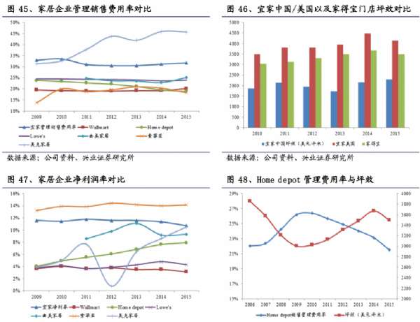 宜家盈利能力相较同类具有显著优势,净利润高于同类的家具零售商Home depot、 Lowe’s,这主要得益于宜家高效的供应链管理及较高的坪效,仅管宜家相应的营销管理费用率也较高(相较 Home depot 门店面积更大且全球管理运营)。随着营销管理效率的提高及新开门店的成熟,前期的营销管理投入逐步带动后期的坪效上升,宜家的销售管理费用率进一步摊薄,Home depot表现出类似的趋势。我们测算宜家中国的坪效相较宜家美国的坪效还具有较大提升空间。