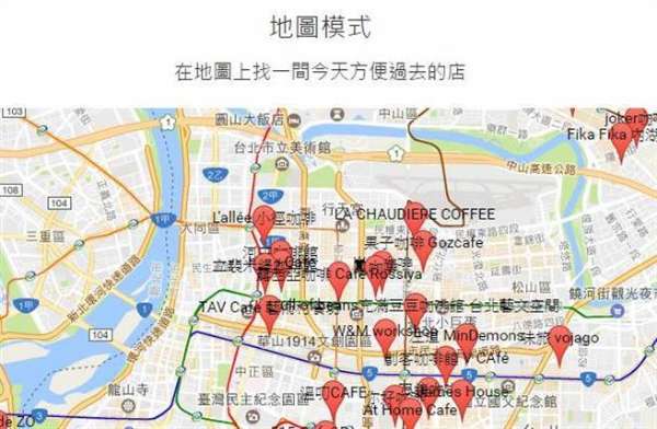 咖啡地圖開放清單或地圖模式瀏覽,清單模式提供Wi-Fi穩定、通常座位、咖啡美味以及價格程度評分機制,用戶可依照個人需求篩選排列,找到符合條件的咖啡店;地圖模式則可直接透過地圖,根據所在縣市、地點,挑選一間當天方便前往的店家;同時也導入各咖啡廳臉書粉絲團動態,咖啡迷能即時掌握最新訊。