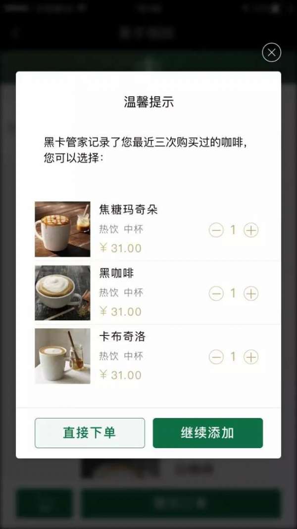 当持卡人每新订一种咖啡口味并支付成功时,黑卡管家会立即记录本次下单的咖啡甜点口味,下次购买时,用户可以快速选择历史购买记录里的口味,直接下单。