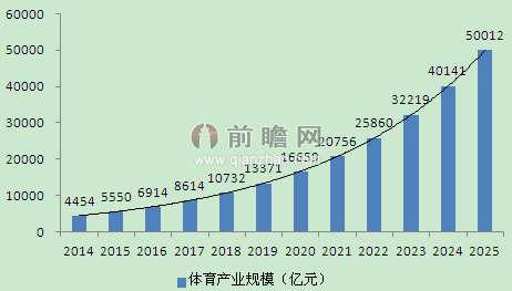 据前瞻产业研究院发布的《中国体育产业发展前景预测与投资战略规划分析报告》分析,2014年以后,体育产业将保持年均24.59%的增速,到2020年,体育产业规模为16659亿元,2025年接近5万亿元。