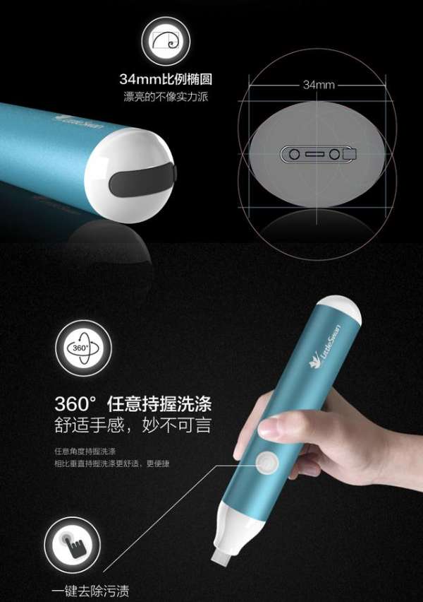 该洗衣机非常小巧,三围34x31x200mm,重185g,拥有三色可选,采用900mAh可充电设计。