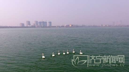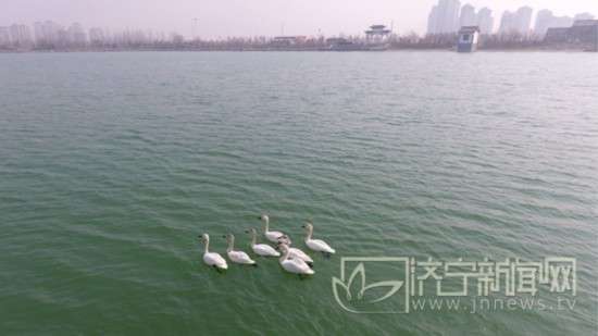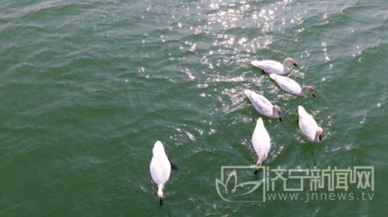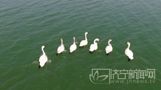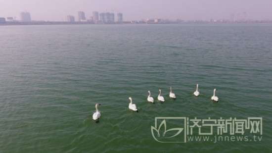七只 小天鹅 时而在空中盘旋,时而在湖面嬉戏、觅食,时而展翅滑翔、轻盈踏水,时而引颈长鸣、呼朋引伴,为 水泊梁山 这片美丽的山水增添了一份灵气和生动,形成了一道独特的风景。
