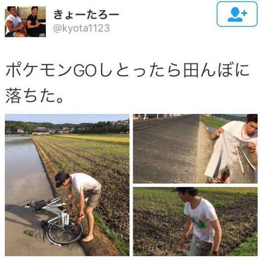 图为一位玩家在骑车时玩PMGO而掉进田里