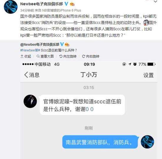 今天有粉丝提问Newbee官博,Sccc在退伍前是属于什么兵种,在答复是消防兵之后,官博娘也讲起了选手间的一个趣闻。