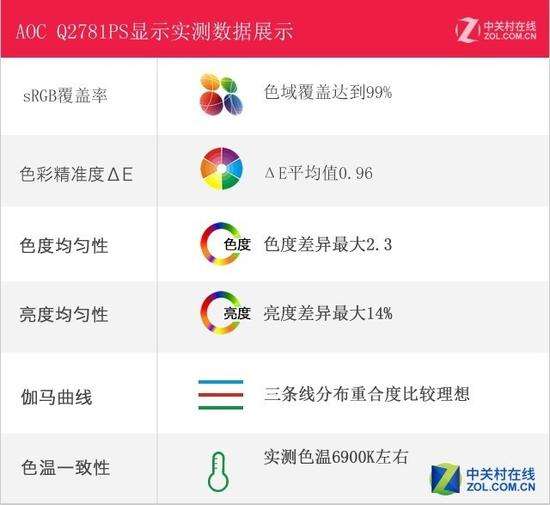 下面进行性能实测部分,测试项目有色域覆盖率、色彩还原准确度、色温一致性、色度均匀性、亮度均匀性、伽马曲线等。众多的测试项目让我们从多个方面来全方位审视AOC\u00A0Q2781PS。