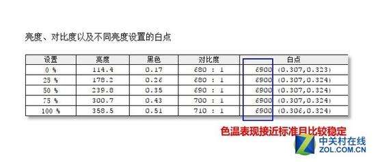 接下来,我们进行色温一致性的测试的目的在于考验显示器在不同亮度下白点色温的稳定性,用户可能会随时调节显示器的亮度,此时对比度和色温不应该发生太大的变化。我们分别将AOC\u00A0Q2781PS的亮度调节到0%、25%、50%、75%和100%,测试全白画面亮度和全黑画面亮度以及色度坐标,计算出对比度以及色温值,各个亮度下色温值和对比度比值不应发生太大变化。