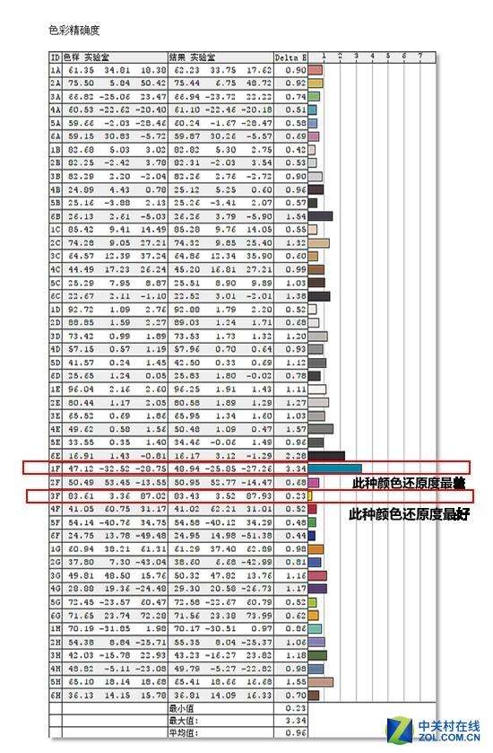 注:ΔE值反映的是显示器与标准值之间差距的大小,因此其数值越小越好,分数越高说明色彩越失真。