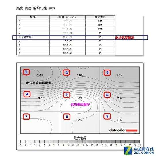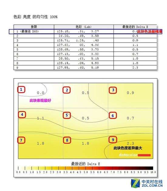 均匀性测试分为亮度均匀性和色度均匀性两部分。在测试环节,对屏幕均等划分为9个区块(见图中标注)。校色仪会在测试中测出每个区块不同百分比的亮度和色度坐标情况的最大差异值,从而确认这款显示器在均匀性方面的表现好坏程度。