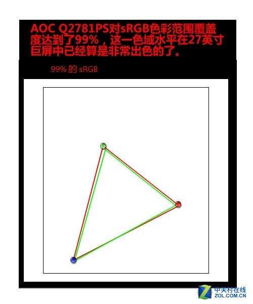 理论而言,红色的区域如果完全覆盖绿色的sRGB色彩空间是最为理想的。而通过实际测试结果来看,代表AOC\u00A0Q2781PS色域的红边三角形基本完全覆盖了sRGB全部的色彩空间。AOC\u00A0Q2781PS对sRGB色彩范围覆盖度达到了99%。