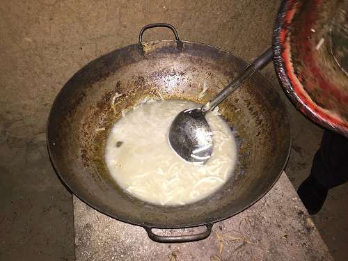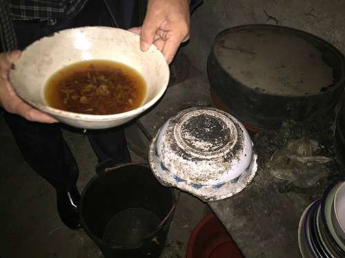 经得本人同意,我们被允许进入本村无保户杨双根的家中一探究竟,只见破旧的木门伴随着阵阵霉味缓缓打开,眼前的一切着实让在场的志愿者们目瞪口呆,漆黑泛着霉味的土坯房里伸手不见五指,用手机微弱的灯光我们将房间打量了一番,厚厚的灰尘充斥着整个房间,探眼望去没有一个像样的家具,灶台上肮脏不堪,只有一锅淡而无味的剩面条得以充饥,据村支书说像如此窘况的无保户,这里还有8家。