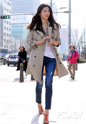 点评:经典的卡其色风衣,系上腰带,让你下半身比例更显完美~搭配的黑色牛直筒裤子穿上平底鞋,则衬托气质!