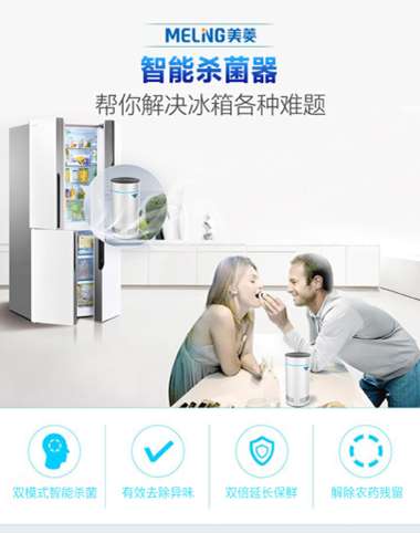 除此之外,美菱还针对冰箱“易生细菌、保鲜效果差、异味肆虐”的痛点研发出了“冰箱智能杀菌器”。这款身高103mm,直径50mm的小巧装置,能够通过内置