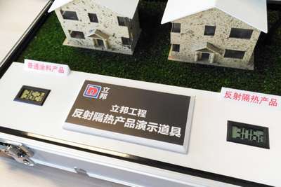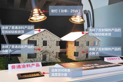 为了验证外墙反射隔热涂料的节能降温效果,立邦工程团队制作了一套装置进行专业的测试。测试中,通过设置同功率、同距离、同角度的射灯照,分别照射涂装了相同岩彩效果(卡拉麦里金)的普通外墙涂料和外墙反射隔热涂料的两个小房子,以房子内温度判断材料的隔热效果。经过实际操作,在相同的照射时间下,涂刷了立邦反射隔热产品的小房子室温比涂刷普通涂料的小房子室温低5.6℃,验证了降温节能的功效。