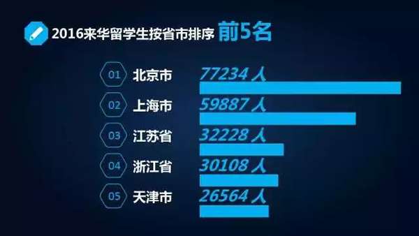 同时,越来越多的留学生来华攻读学历课程,学历生和研究生占比实现双增长。2016年在华学历生人数达21万人,占来华留学生总数的47.4%,比2012年提高了7个百分点;硕博研究生人数达6.4万人,占总人数的14.4%,比2012年提高了3.4个百分点。另据统计,2016年共有13万名外籍学生在我学前教育机构和各类中小学就读,各级各类外籍学生总数已逾57万人。