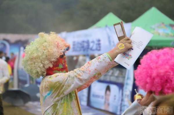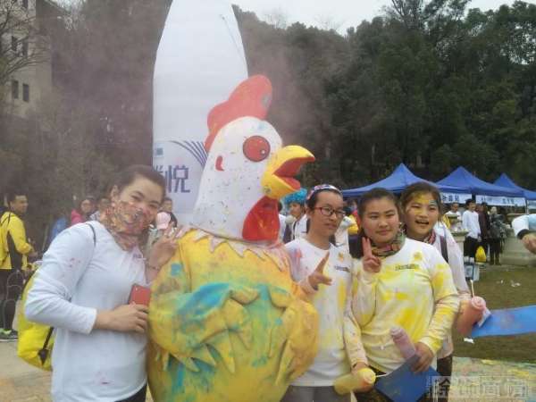 在活动开跑前,不少跑步爱好者本来就用彩色“玉米粉”在脸上和身上化了妆,用各种奇装异服和道具装扮自己,为自己创造了一身独一无二的“彩跑”战袍,回到终点后,他们更是用彩色玉米粉相互攻击和涂抹,头发上、衣服上、脖子里,到处都经历了五颜六色的洗礼,身着COSPLAY服装的小公鸡更是成为了现场的焦点,连活动的美女主持人都未能幸免。整个活动现场沉浸在五彩缤纷的欢乐海洋中。