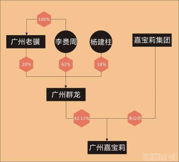 广州群龙成立时间比广州嘉宝莉稍早一周,其实则李赉周控制下的企业,其股东包括自然人李赉周、杨建柱和法人股东广州市老骥建筑装饰有限责任公司(下称“广州老骥”),分别出资322.4万元、93.6万元和104万元;其中广州老骥为李赉周100%出资设立的企业,成立于2016年8月。这意味着李赉周直接和间接合并拥有广州群龙82%的股权。