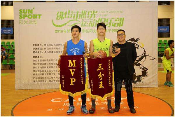 佛山市阳光运动俱乐部副会长蔡奋强先生为“MVP”波西米亚队6号球员黄耀盟,“三分王”纯视监控队8号球员罗家豪颁奖
