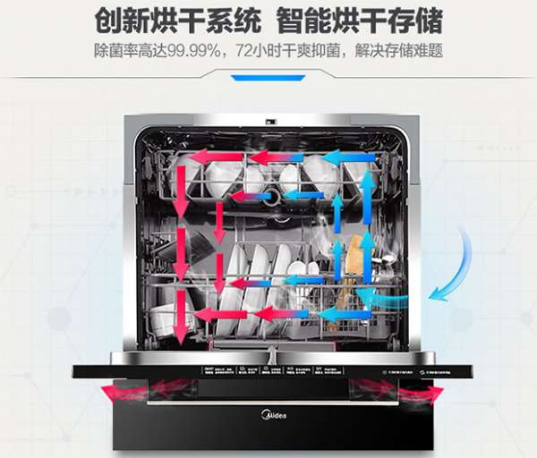 创新烘干系统,智能双重干燥系统,内置主动风干系统,引入外部冷空气,排除内部潮湿水汽,快速干燥餐具,智能启动,排出水汽和霉菌,保持餐具72小时干爽,除菌率高达99.99%,解决存储难题。