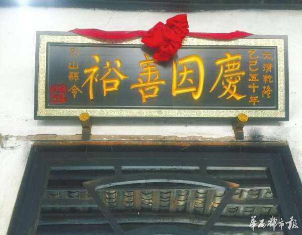 80字的族规,源于刘氏祠堂内的三块匾额。刘壮指着三块黑底黄字的匾额说:“这三块匾额,都是清乾隆年间的彭山县令所赐,挂于正厅、南厅和北厅,分别写有 庆因善裕 、 醇谨可风 、 树德流香 ,反映了不同时期,彭山县令对刘氏宗族的评价。”