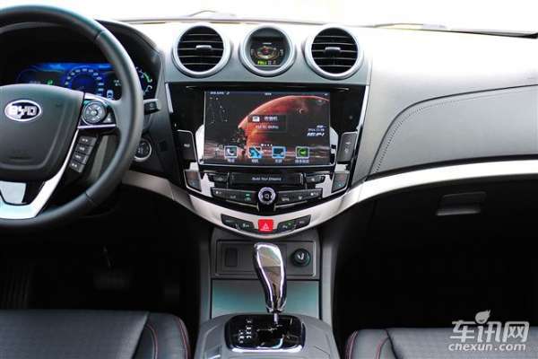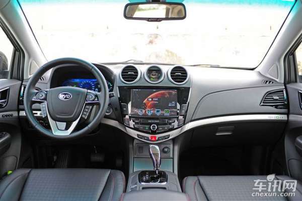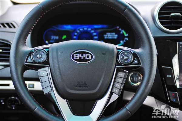 12英寸宽的超大纯液晶仪表盘的显示效果还是十分出色的,不仅界面足够炫,可显示的内容也十分丰富,这是比亚迪的拿手好戏。10.2英寸的中控液晶屏十分显眼,中间横穿的银色饰条很好的分割了仪表台的上下两部分。方向盘握感厚实,多媒体按键很丰富并且采用中文标识,做法值得提倡。
