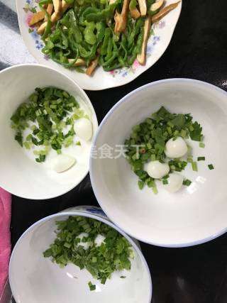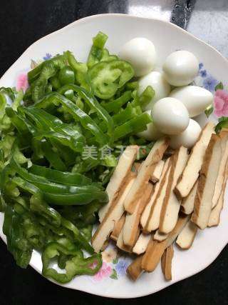 青椒、香干切丝如图所示,鹌鹑蛋买的熟的