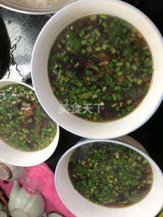 把芹菜末、韭菜叶末、鹌鹑蛋放入碗底,倒入熬好的汤料。