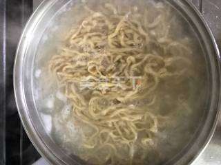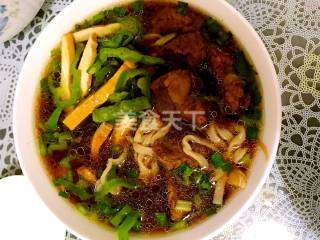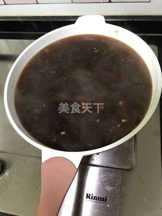 放入镇江锅盖面特制酱油,翻炒一下后放入牛肉汤。继续烧,等牛肉高汤烧开后,关火。