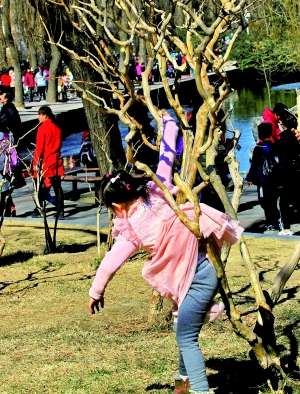 动物园,一个小朋友爬上小树嬉闹,结果掉下来被树枝挂住,受了皮肉之苦。文伟奇/摄