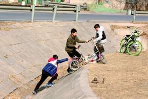 大兴区庞各庄,几个孩子推着自行车“翻山越岭”横穿河道沟。家长应当教育孩子遵守交通法规,避免受到意外的伤害。张亮亮/摄