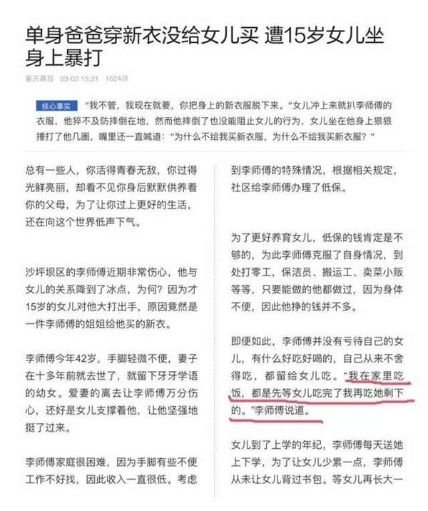 近日,重庆的一位单亲父亲因为被自己含辛茹苦养大的女儿暴打,陷入了深深的悲伤中。