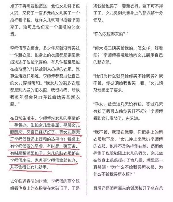 现年42岁的李师傅妻子早逝,他独自把女儿抚养到如今的15岁,因为妻子去世时女儿年纪还很小,所以李师傅对女儿格外怜爱,虽然家境贫寒,他本人手脚还有一点残疾,但为了给女儿创造一个好的成长环境,他可以说是穷尽了自己的所有,付出了最大的努力。