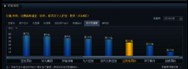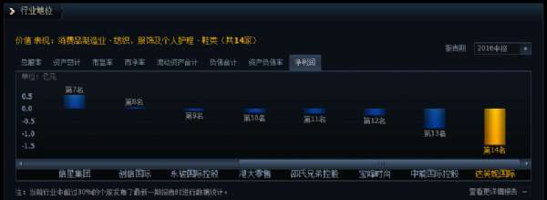 另外据同花顺资料显示,在其统计的14家港股服饰、鞋类公司中,2016年中期,达芙妮净利润排最后一名。2015年,达芙妮的排名为第13名。在资产负债率方面,2016年中期,达芙妮排名为第12名,具体数值为23%。