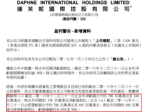 3月3日晚,达芙妮公布盈利警告新增内容,并没有亏损减少,或者扭亏为盈等反差性过强的字眼,依旧是熟悉的净亏损增加。其预计2016年全年净亏损在7.9亿至8.4亿港元之间,华丽丽的超过了此前预计的增幅约逾50%(2015:净亏损3.79亿港元,),即超过5.68亿港元。与此同时,其经营亏损在7.86亿港元至8.45亿港元之间,去年同期为4.98亿港元,亏损增幅约为58%至70%。